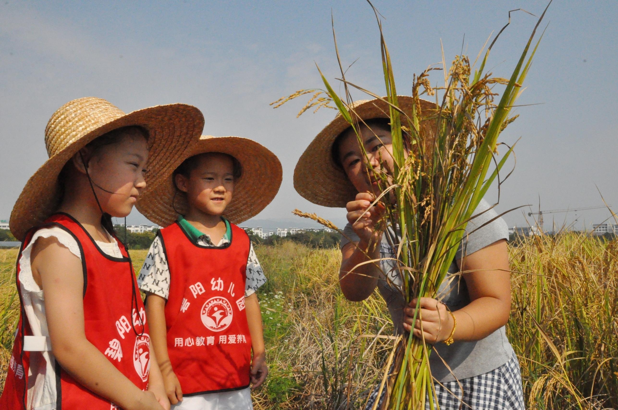 10月13日,黟县碧阳幼儿园的孩子们在横岗村稻田里听老师讲解稻谷的知识,“零距离”观察稻子生长,树立爱惜粮食意识和习惯。 本报通讯员 朱光明 摄