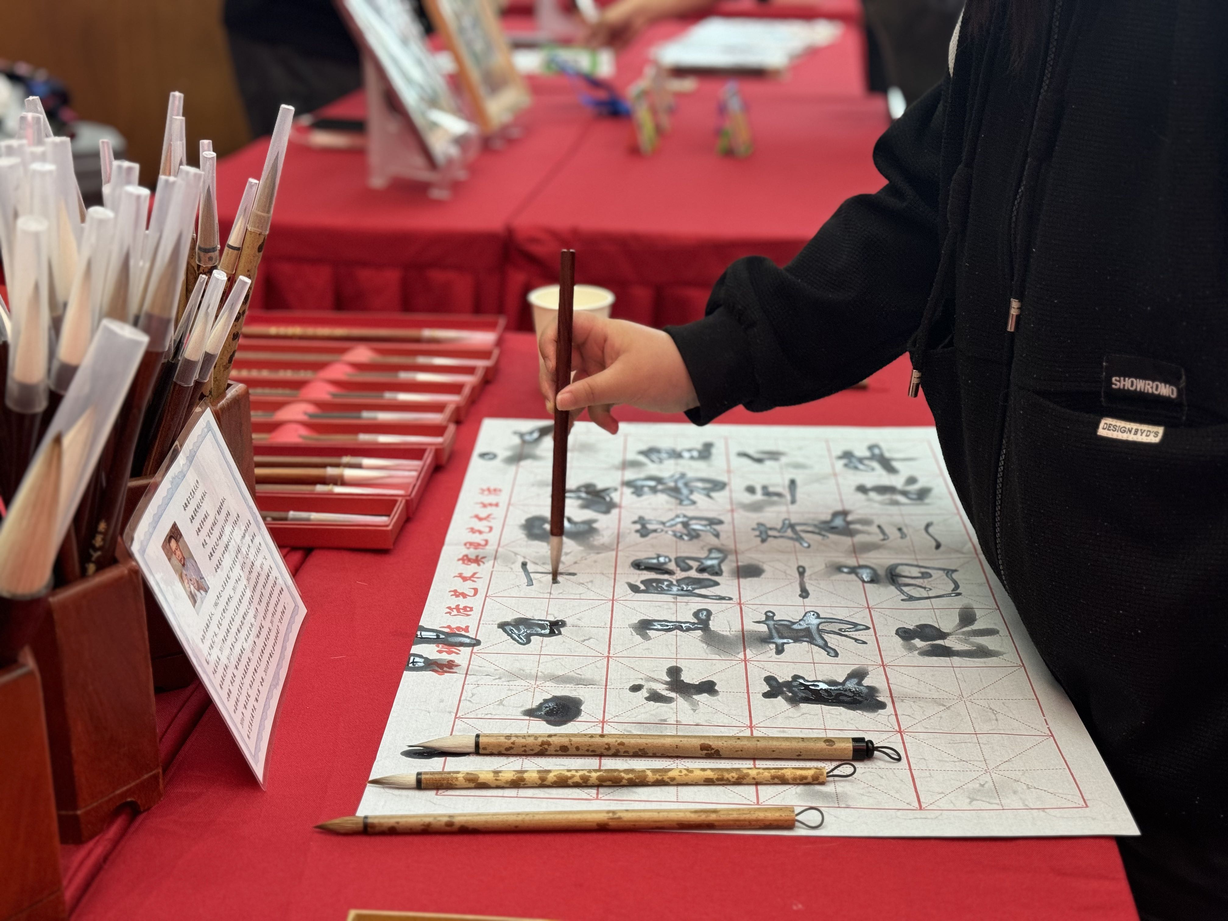 界首彩陶、歙砚、徽墨、纸笺加工技艺、宣笔、阜阳剪纸、界首木板年画、临淮泥塑、泾县油布伞……当天下午,12位国家级、省级非遗项目代表性传承人受邀带着各自的“绝技”走进学院,在校内摆开展位。学生们围聚在传承人周围,聆听非遗项目背后的故事、了解其中制作工艺、动手参与体验,在交流互动中感受非遗的独特魅力。