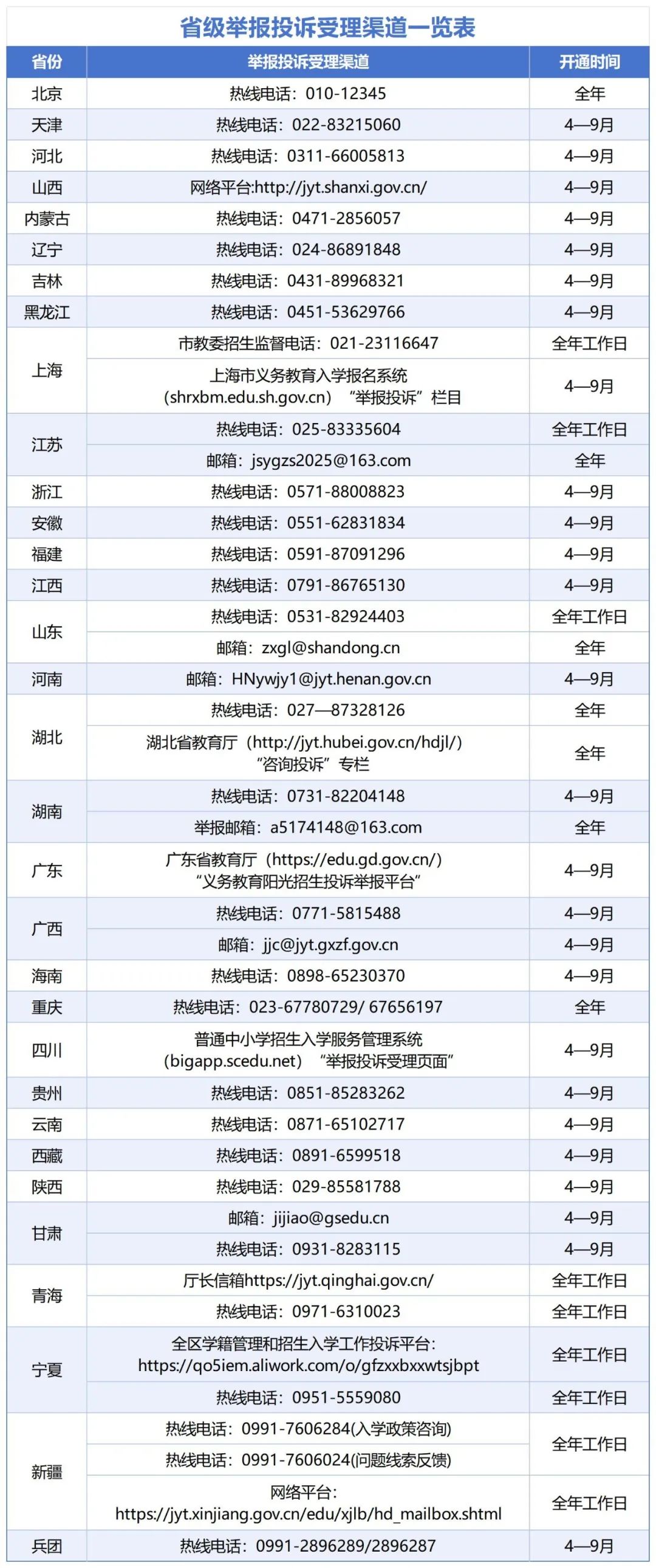 (二)接受社会监督。教育部于4—9月在中国教育督导微信公众平台设立“义务教育违规招生问题”专栏。各地教育行政部门要畅通举报投诉受理渠道。县级教育行政部门要设立专门的招生入学热线并主动公开,对群众反映的问题要建立台账、逐一认真核查处置。