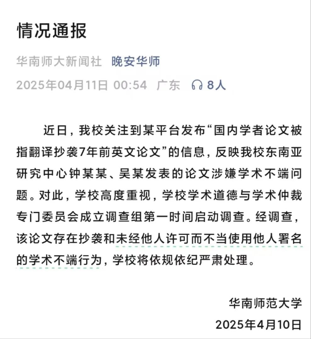 近日,我校关注到某平台发布“国内学者论文被指翻译抄袭7年前英文论文”的信息,反映我校东南亚研究中心钟某某、吴某发表的论文涉嫌学术不端问题。对此,学校高度重视,学校学术道德与学术仲裁专门委员会成立调查组第一时间启动调查。经调查,该论文存在抄袭和未经他人许可而不当使用他人署名的学术不端行为,学校将依规依纪严肃处理。