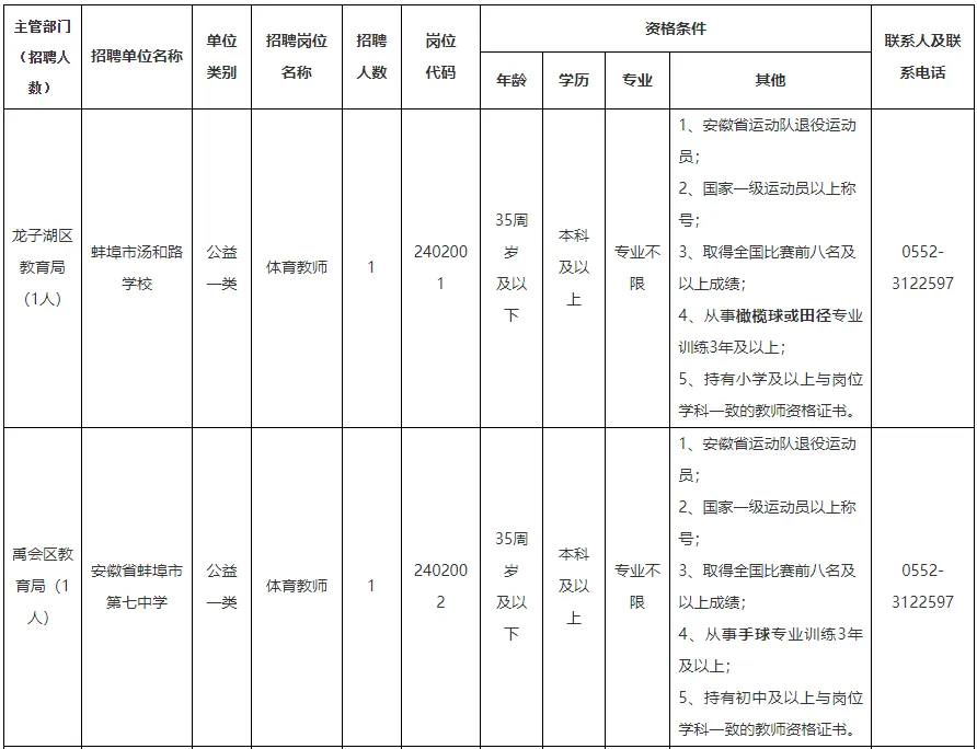 公告显示,蚌埠市2024年度第二批面向我省退役运动员公开招聘体育教师5名(具体招聘岗位、条件详见下表)。