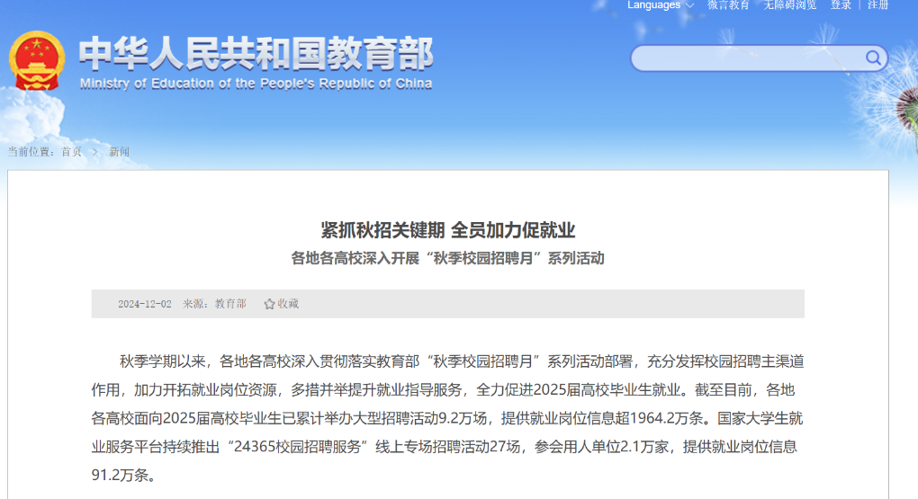 记者12月2日从教育部获悉,秋季学期以来,各地各高校充分发挥校园招聘主渠道作用,加力开拓就业岗位资源,多措并举提升就业指导服务,全力促进2025届高校毕业生就业。截至目前,各地各高校面向2025届高校毕业生已累计举办大型招聘活动9.2万场,提供就业岗位信息超1964.2万条。
